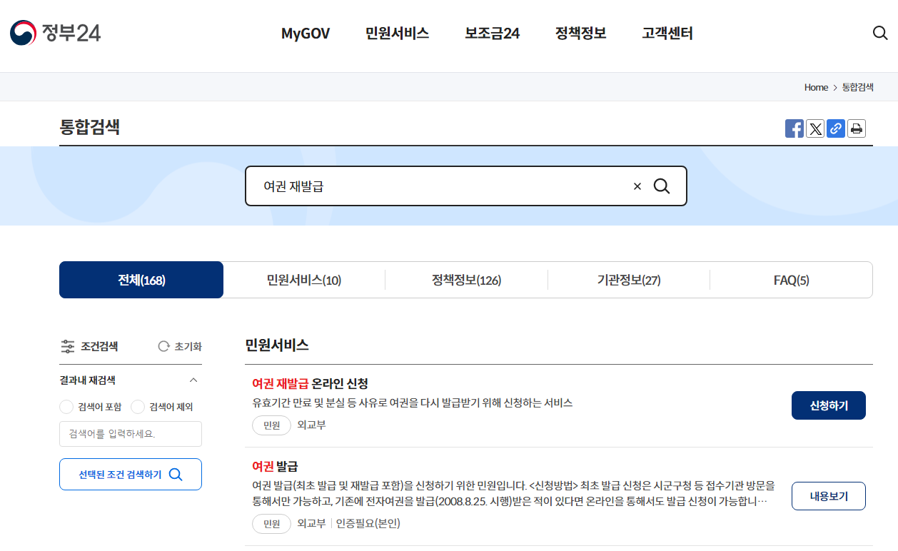 정부 24에 가서 여권 재발급을 통합검색에 입력한 후 아래 여권재발급 온라인 신청 - 신청하기 버튼 누른다.