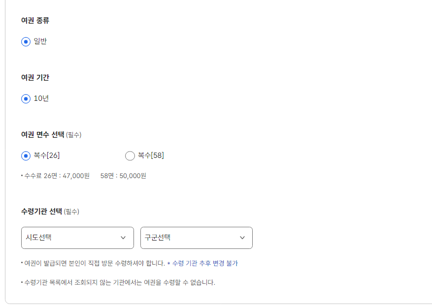 여권의 종류 와 기간은 이전에 발급받은 대로 되어있습니다.