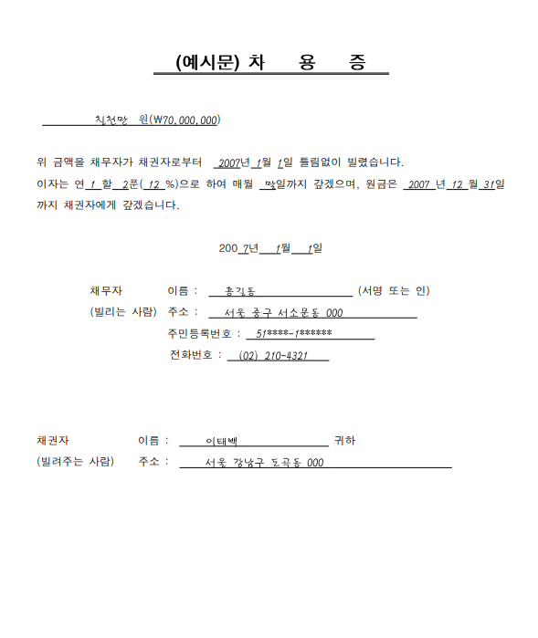 빌려주는 사람과 빌리는 사람이 문서로 남겨 두는 문서입니다.